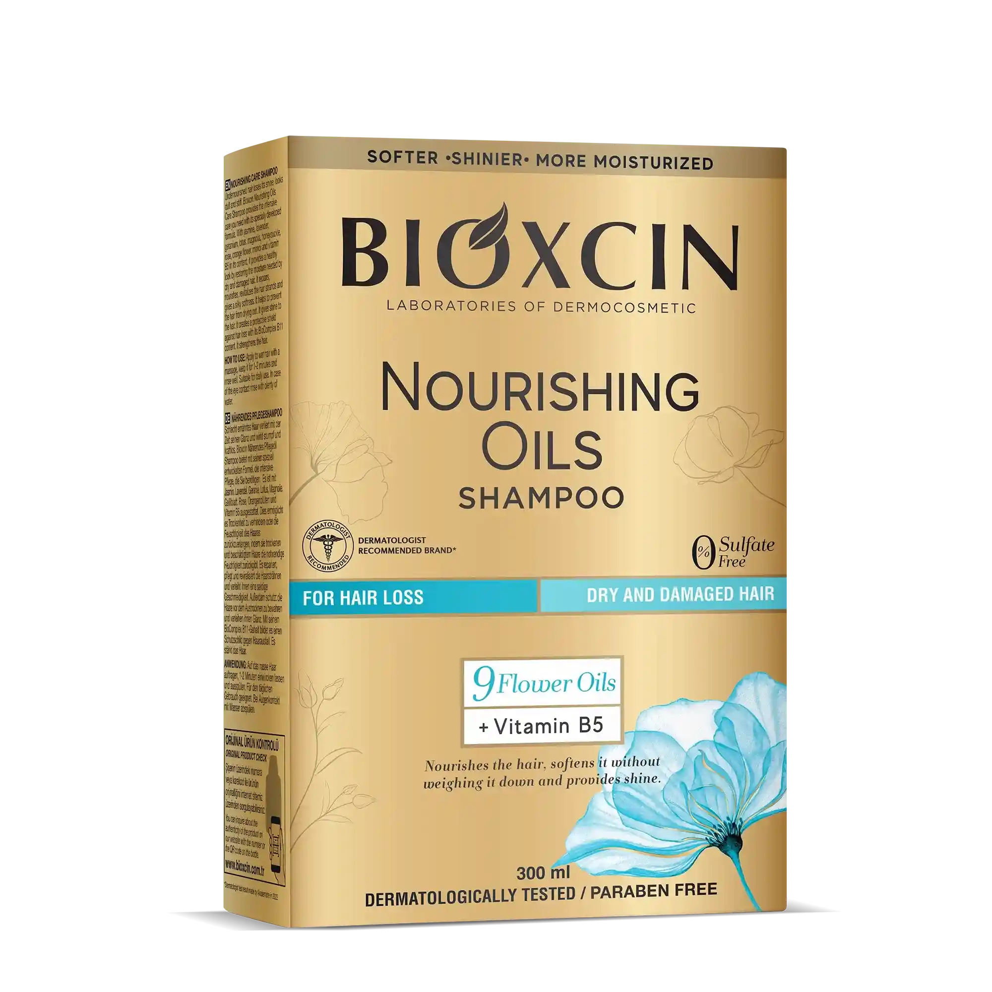 The Nourishing Oil Hair Care Shampoo, developed for dry and damaged hair, moisturizes, nourishes, provides silky softness, and strengthens the hair with the oils of 9 flowers, vitamin B5, and BioComplex B11.